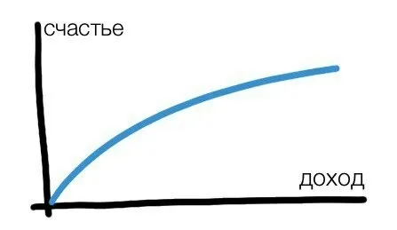 В начале горизонтальной оси, линия зависимости довольно быстро идет вверх — уровень счастья растёт, а человек начинает удовлетворять не только базовые, но и другие первостепенные потребности. Но после того, как все они удовлетворены, линия становится все больше похожа на прямую.